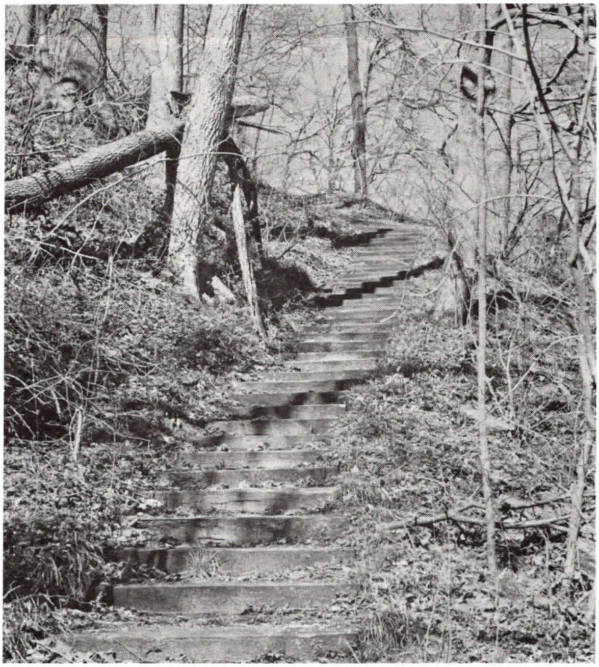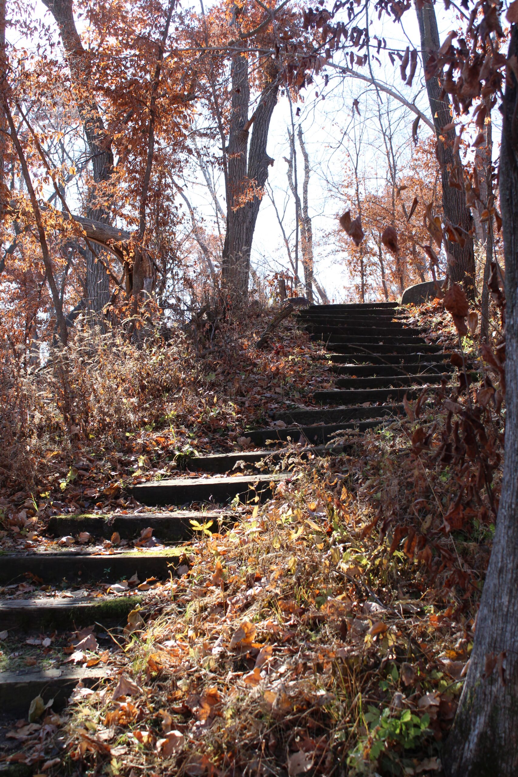 Returning to the steps, you realize you don’t have to scale that steep slope by hanging on to trees and shrubs. You remember the poison ivy somewhere in your past and stick to the trail. You’ve been gone longer than you planned and the list of things you have to do at home grows with each step. They seem so monumental until you realize you’re almost at the top. You turn around to remember where you are and give thanks for your story. Those stairs, like an escalator, have raised you to the bird’s eye view. You see your tasks in perspective, one step at a time. You feel the energy emanating from you and this magic place. Your heart heaves between holding on to this wonderful feeling and having the breath to tell your tale.