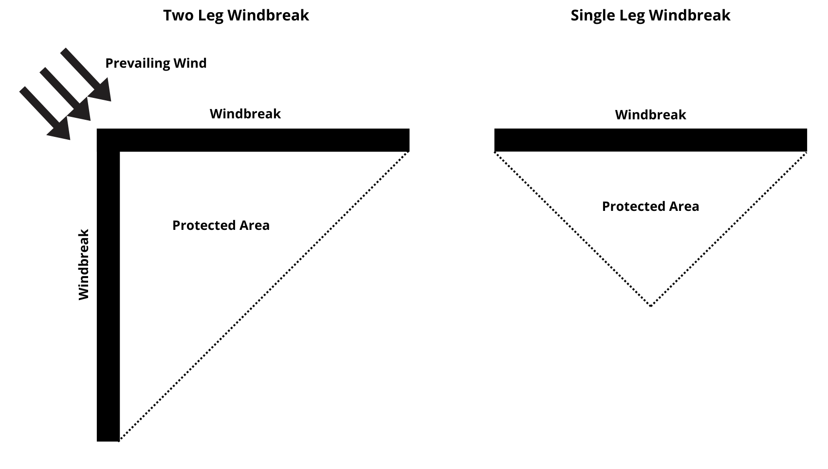 Tree height and number of rows aren’t the only considerations for a protection area. The more directions the wind can be reduced from, the larger the zone of protection. For instance, Iowa receives most of its severe wind from between north and west, so a two leg windbreak perpendicular to those two directions offers a large zone of protection. Meanwhile a single leg windbreak only protects a small triangle from one direction.
