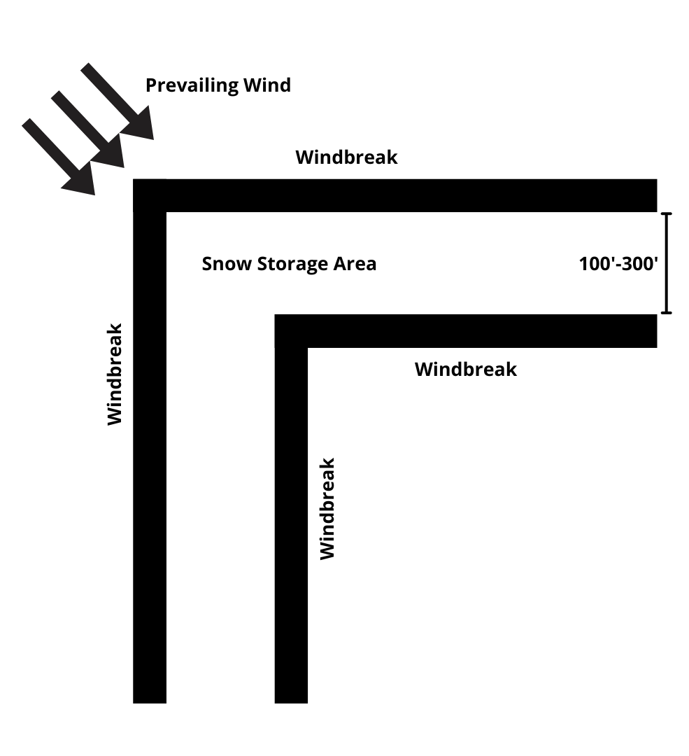 Multiple windbreaks provide the greatest protection downwind and can afford strategies for sheltered access points, areas of extreme protection, or to manage specific windbreak effects. For example, in treeless rural areas or flat farmland it can be difficult to manage snow drifting. Especially around roads, buildings, and vehicles, a small amount of snow can create massive drifts if there is nowhere else for it to accumulate. Layers of windbreaks create pockets of snow storage areas where large drifts can form and accumulate, preventing snow buildup on the leeward side of windbreaks. In areas particularly impacted by drought, these snow storage areas can bank moisture for months into the growing season, providing much needed ground water as weather starts to get dry. Especially in the arid west, double layer windbreaks are one of the few ways to collect seasonal moisture when the only precipitation available for most of the year is snow! For wind sensitive crop species, the space between windbreak layers offers superior year-round protection. For windbreak designers with wildlife habitat goals, multiple windbreaks can provide a scale of magnitude greater habitat than one windbreak alone. One windbreak is great, but more is more!
